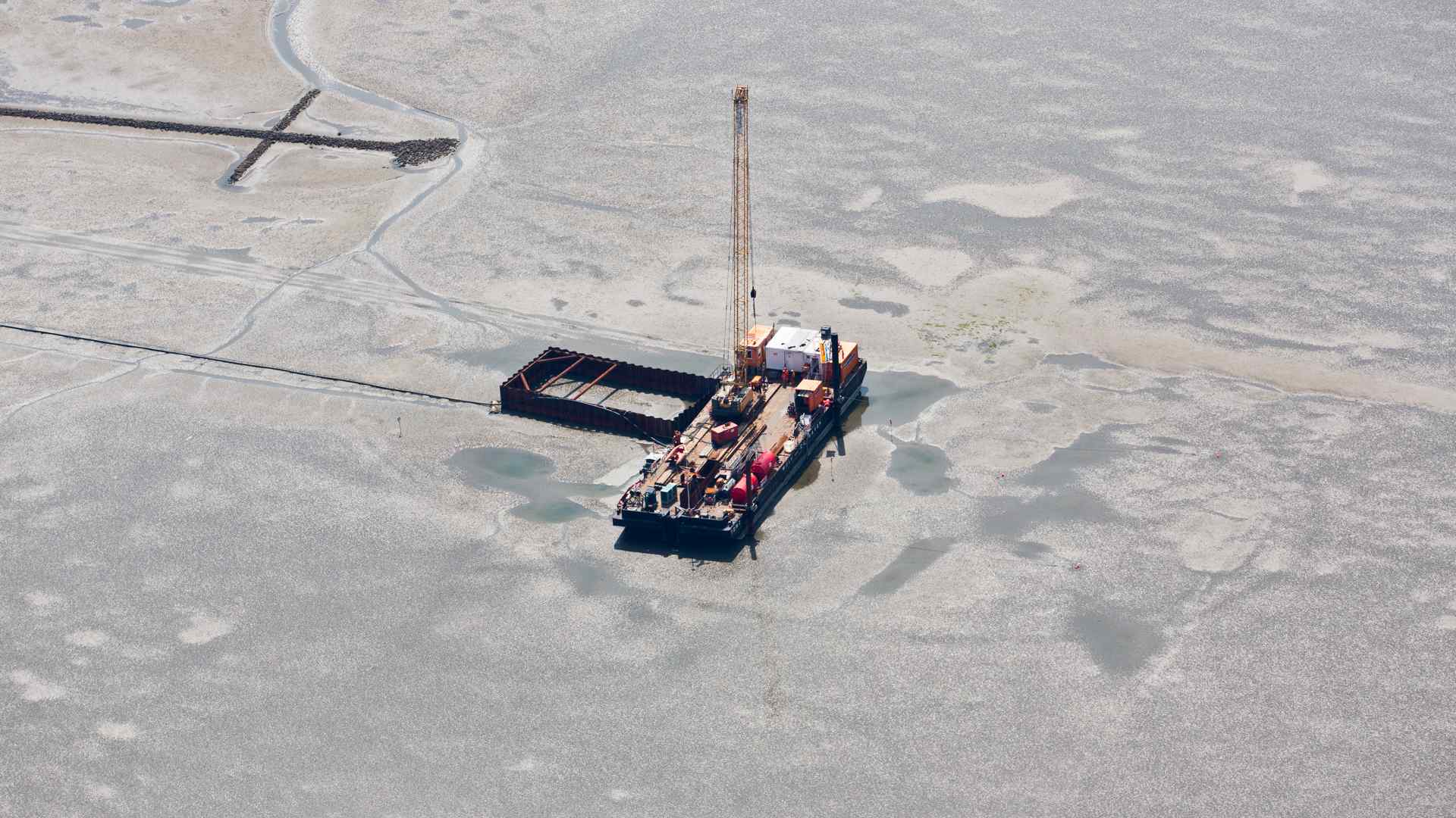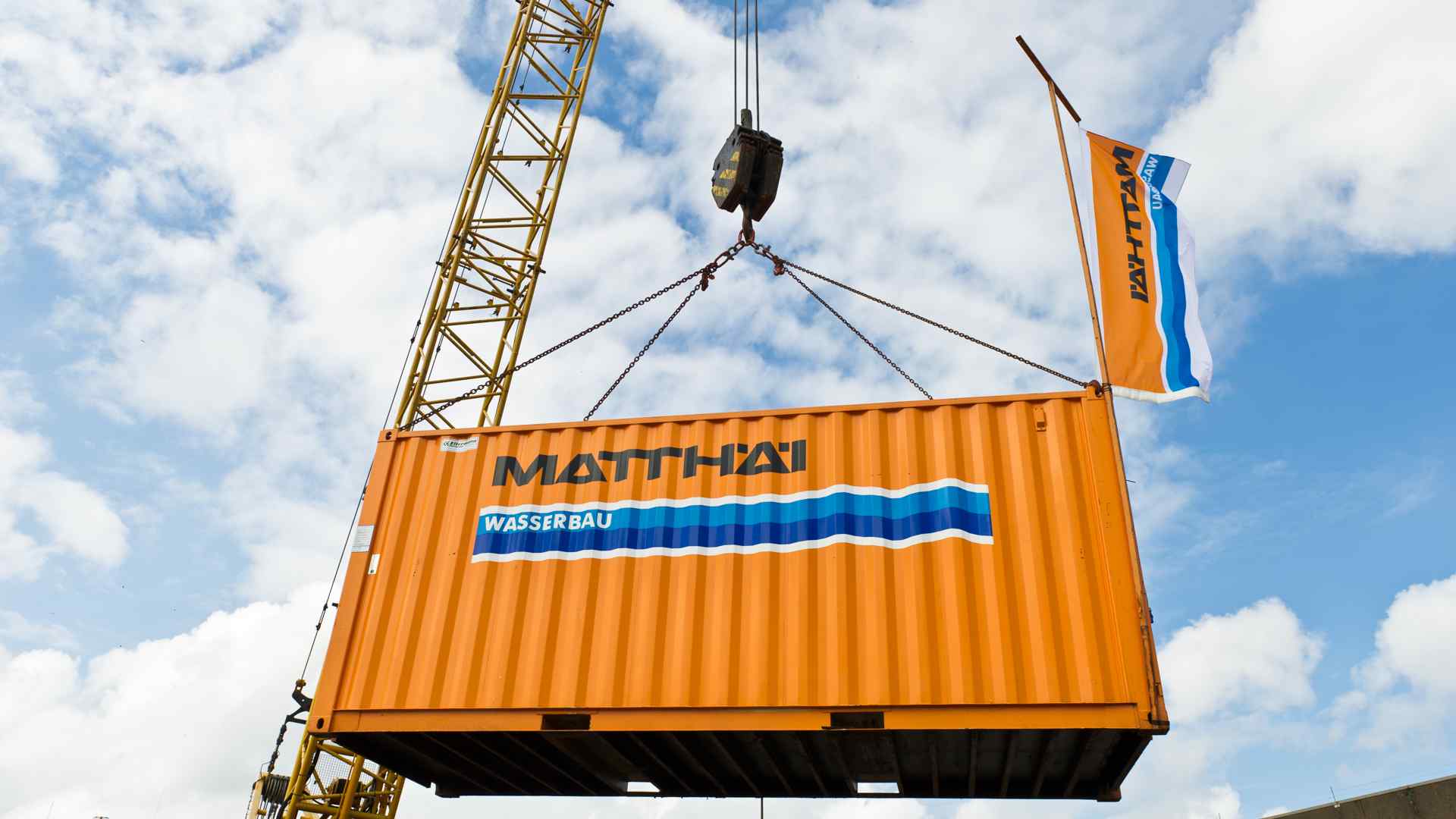 - Matthäi Wasserbau stellt einen 110 t Seilkran auf einem eigens vollständig autark ausgerüsteten Ponton (50x15x3 m) für gezeitenunabhängige Arbeit zur Verfügung.