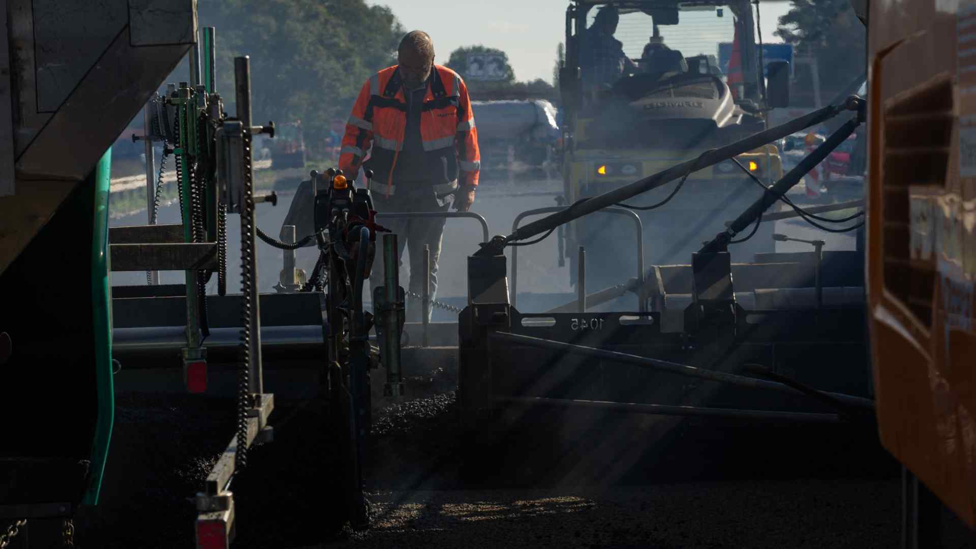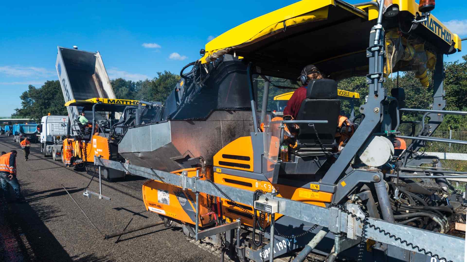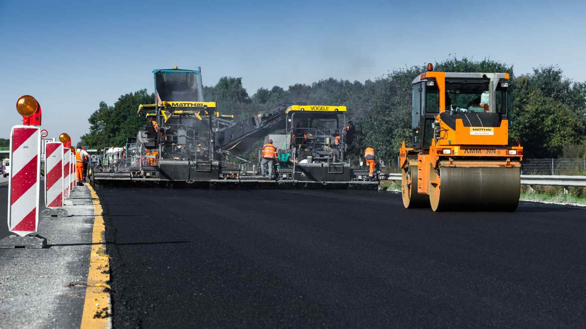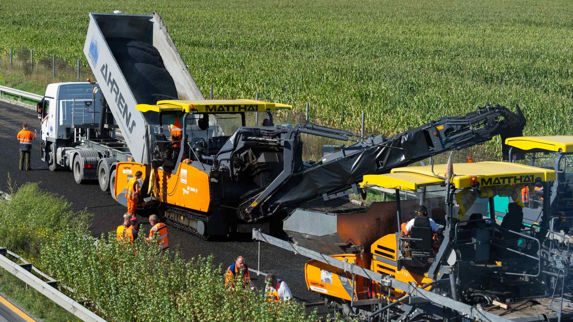 Für den Einbau der Asphaltschichten wurde aufgrund der an den Anschlussstellen variierenden Einbaubreiten im Hinblick auf einen kontinuierlichen Baufortschritt das Verfahren heiß an heiß gewählt. So konnte die gesamte Strecke einschließlich der Verbreiterungen an den Beschleunigungs- und Verzögerungsspuren ohne Mittelnaht oder Tagesansatz hergestellt werden.
