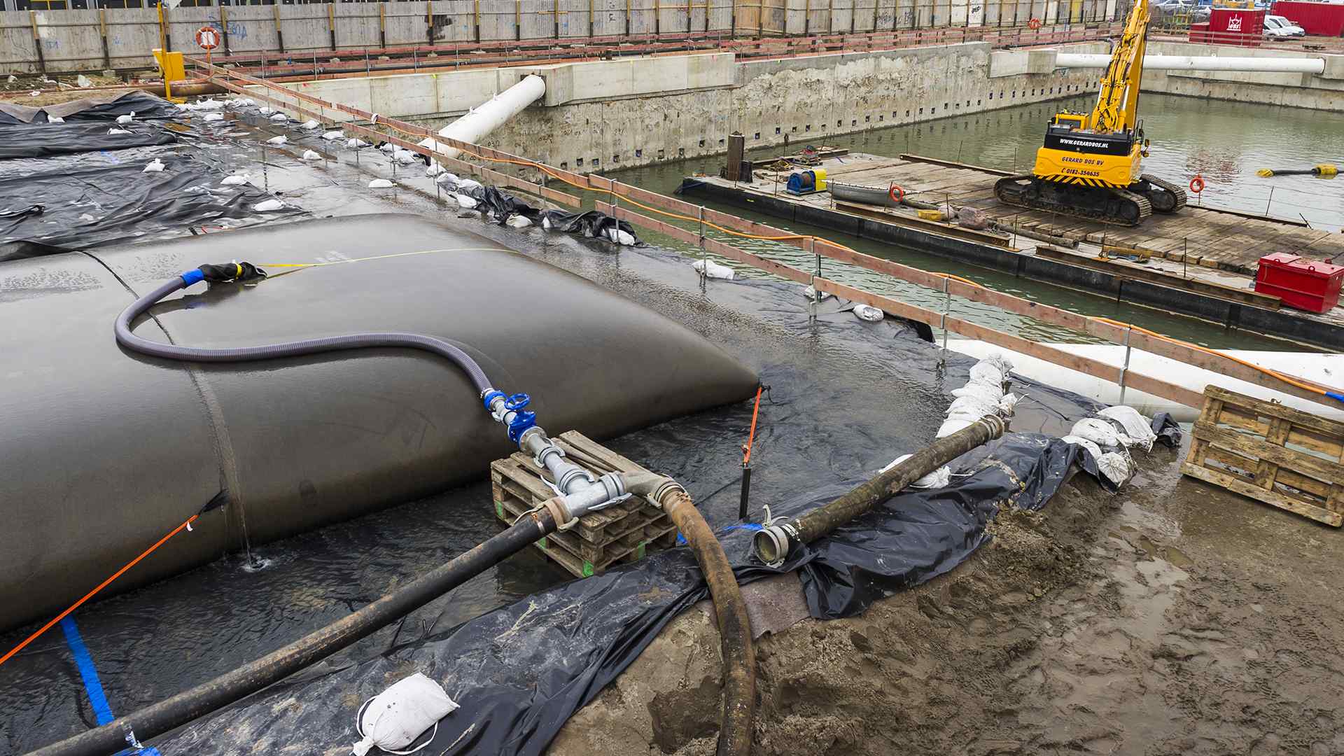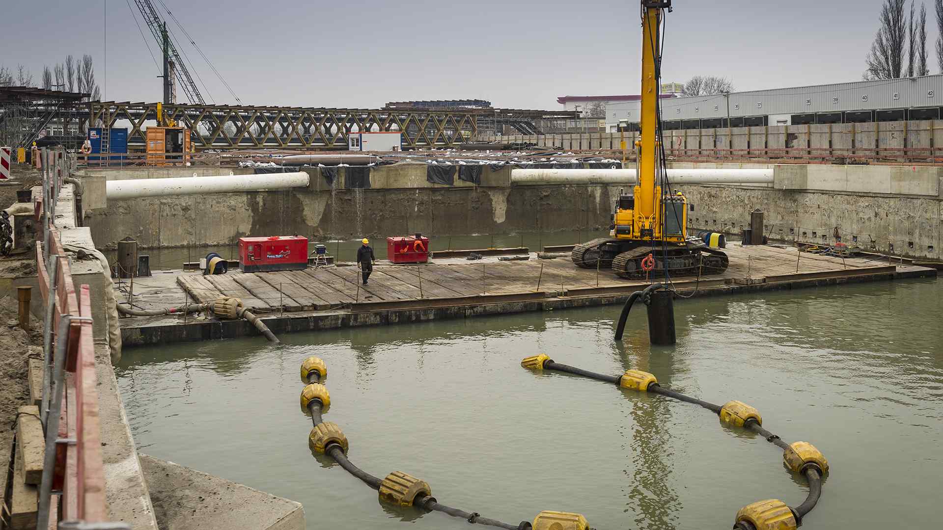 | Ausführung der Arbeiten schwimmend innerhalb der Dockbauwerke (B: 42m, L: ca. 500m) | ||