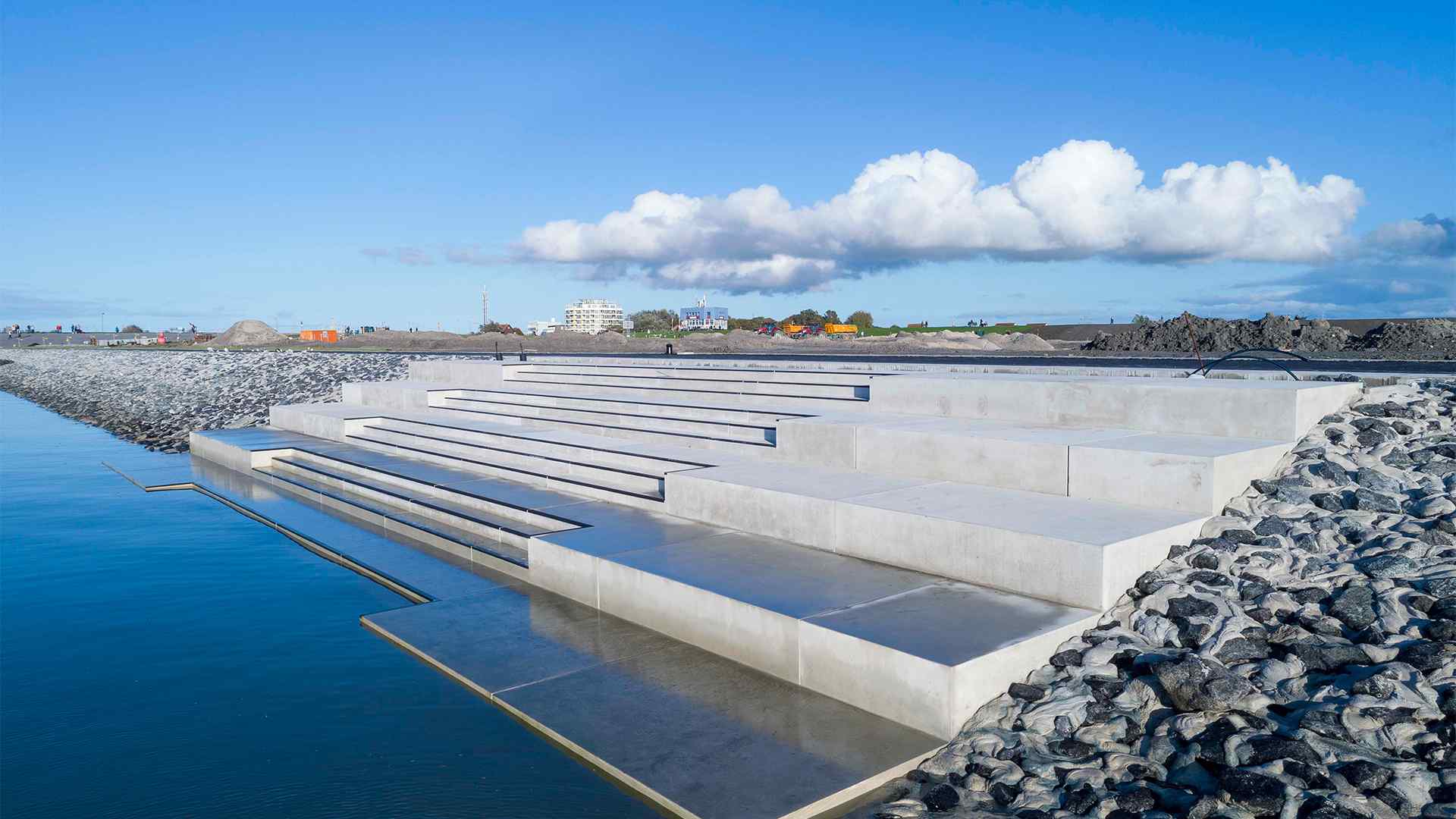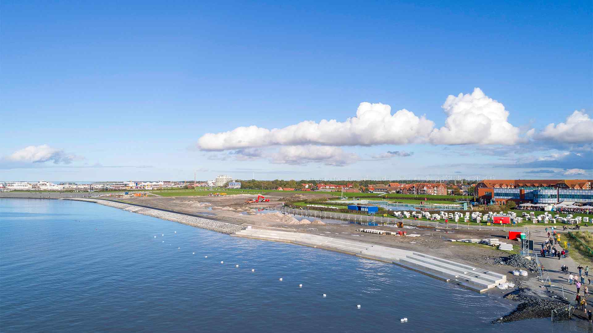 Der NLWKN und die Wirtschaftsbetriebe der Stadt Norden GmbH Bereich Tourismus Service beauftragten die Arbeitsgemeinschaft Tell Bau GmbH und Matthäi Westerstede zur Grundinstandsetzung des Deckwerks und zur Erneuerung der Strandpromenade an der Wasserkante Ost. Dabei ist das schadhafte Deckwerk als teilverklammertes Schüttsteindeckwerk mit anschließender Betonverfüllung erneuert worden. Die Promenade wurde mit sandfarbenem Walzasphalt hergestellt und zusätzlich wurden Sitzbänke, Beleuchtung und ein taktiles Leitsystem für Sehbehinderte eingebaut. Da die Promenade um etwa 1,20 m erhöht wurde, wurde diese Höhendifferenz mit Sand ausgeglichen. Das Wattfenster und die Meeresterrasse führen als Stufenanlagen von der Promenade ins Watt und sind ebenfalls im Rahmen dieses Auftrages aus Betonfertigteilen hergestellt worden.