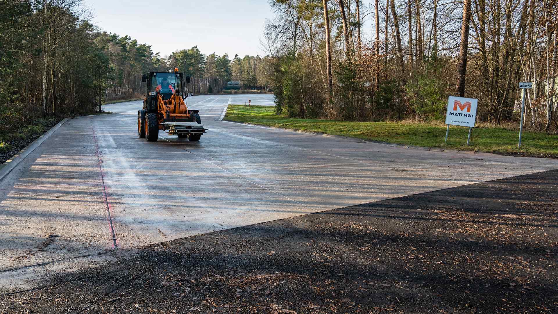 Vorh. Walzbetonflächen mit Multiplex u. Neigungssensor um 10 cm ab- und feinfräsen, Flächen anschließend mit Kehrsaugwagen (Drehjet-Hochdruck) reinigen und zum Betoneinbau vorbereiten. Polymerhaftbrücke aufbringen, Hochleistungsbeton mit Gleitschalungfertiger und im Handeinbau mit Rüttelbohle höhengerecht einbauen sowie nachbehandeln, einschl. Herstellen der Schein-, Press- und Raumfugen im ehemals vorhandenen Fugenraster. Das gesamte Fräsgut wurde aufgenommen, das Feinfräsgut entsorgt und das Grobfräsgut ist in den Postenwegen der Kaserne Hesedorf mit Grader als Wegbefestigung einbaut worden.