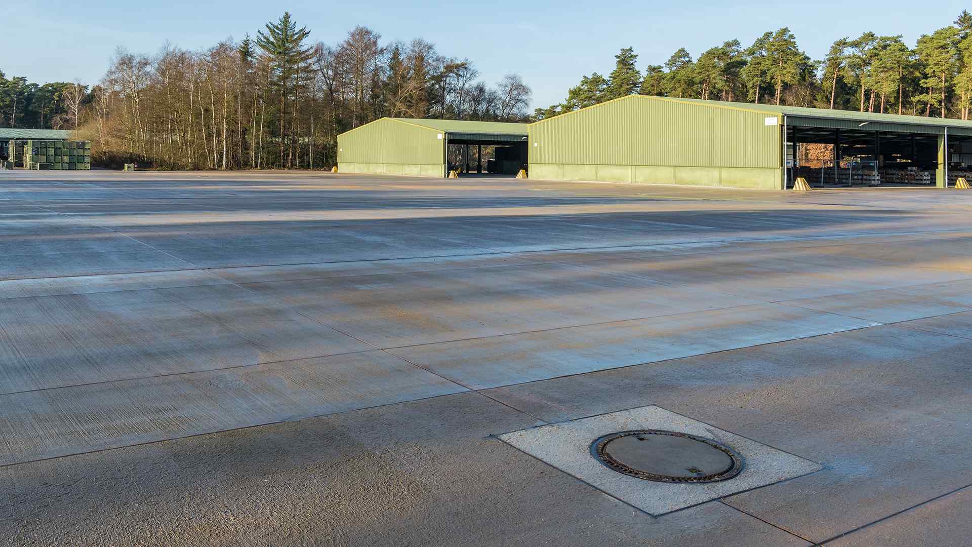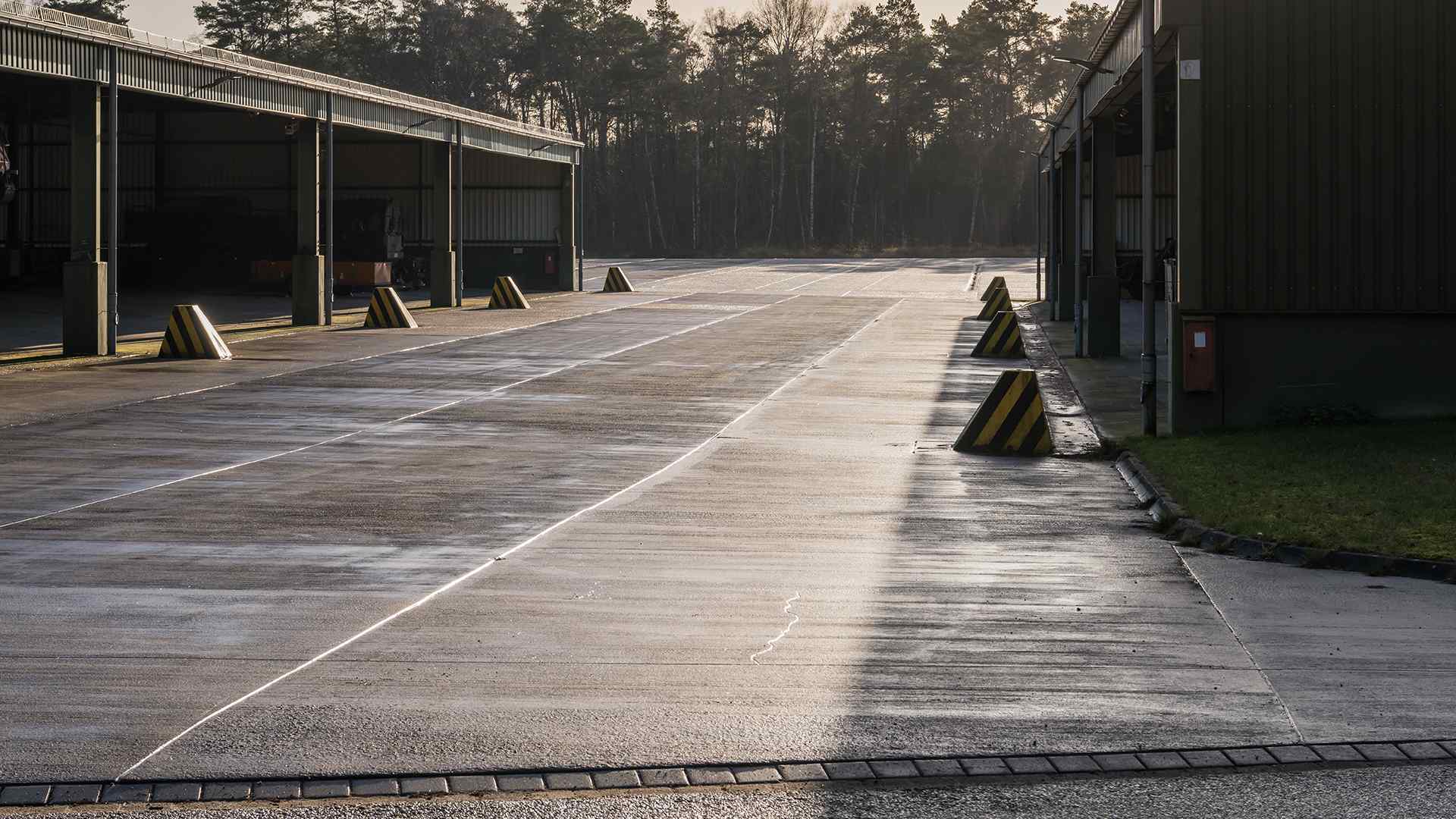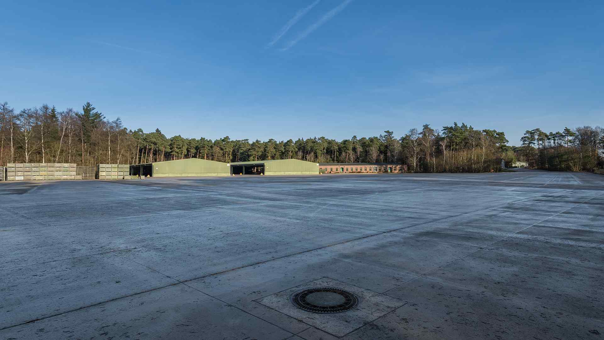 Sanierung der beiden Walzbetonflächen vom Pommernplatz (10.000 m²) und Berliner Platz (33.000 m²) auf dem Gelände der Elbe-Weser-Kaserne in Hesedorf mit Hochleistungsbeton im White Topping Verfahren. Vorhandene Entwässerungseinrichtungen, wie Rinnen, Einläufe und Schächte sind dabei bestehen geblieben, das heißt, daß die vorhandenen Höhen- und Gefälleverhältnisse wie im Bestand wieder hergestellt wurden.