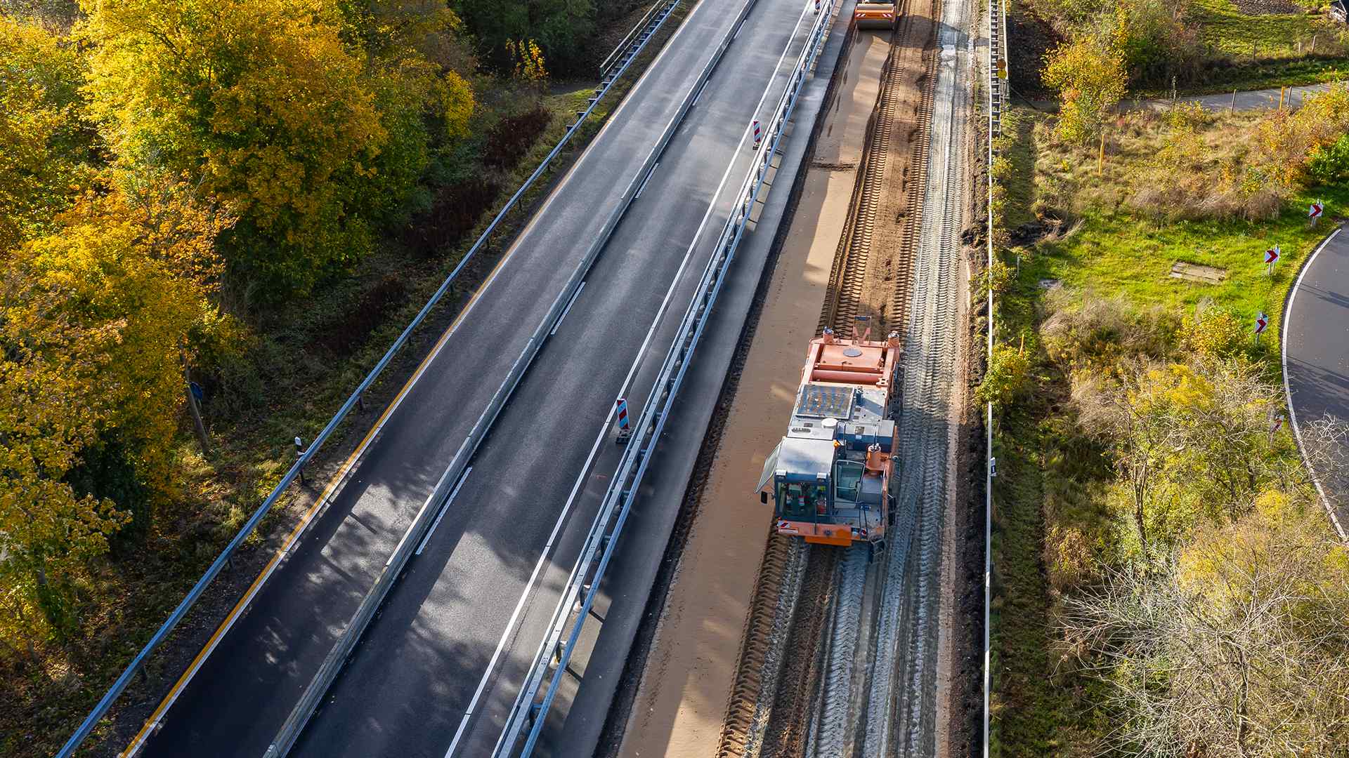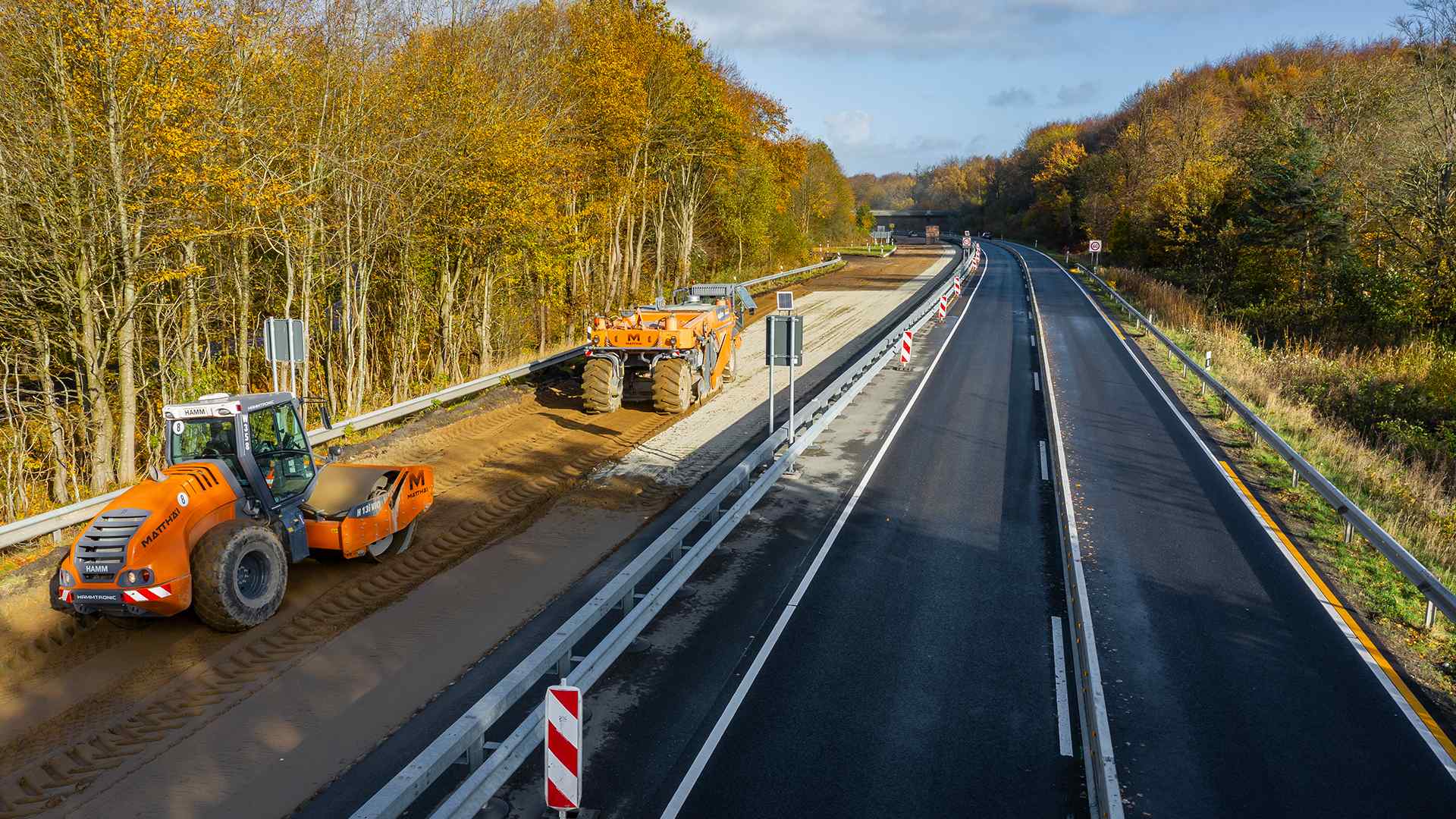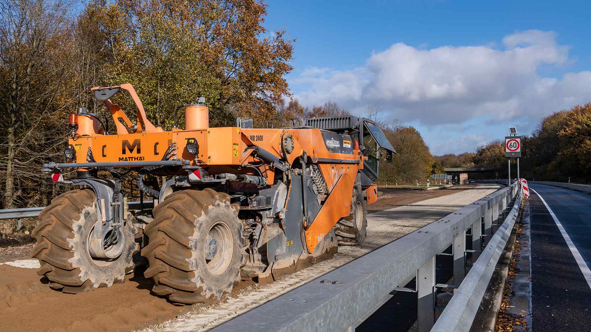 Ausführung der Arbeiten unter halbseitiger Sperrung mit einer Verkehrsführung 2+0, sowie 1+1 in den Umbauphasen. Kompletter Rückbau der vorhandenen Asphaltbefestigung mit anschließender Profilierung der Frostschutzschicht.