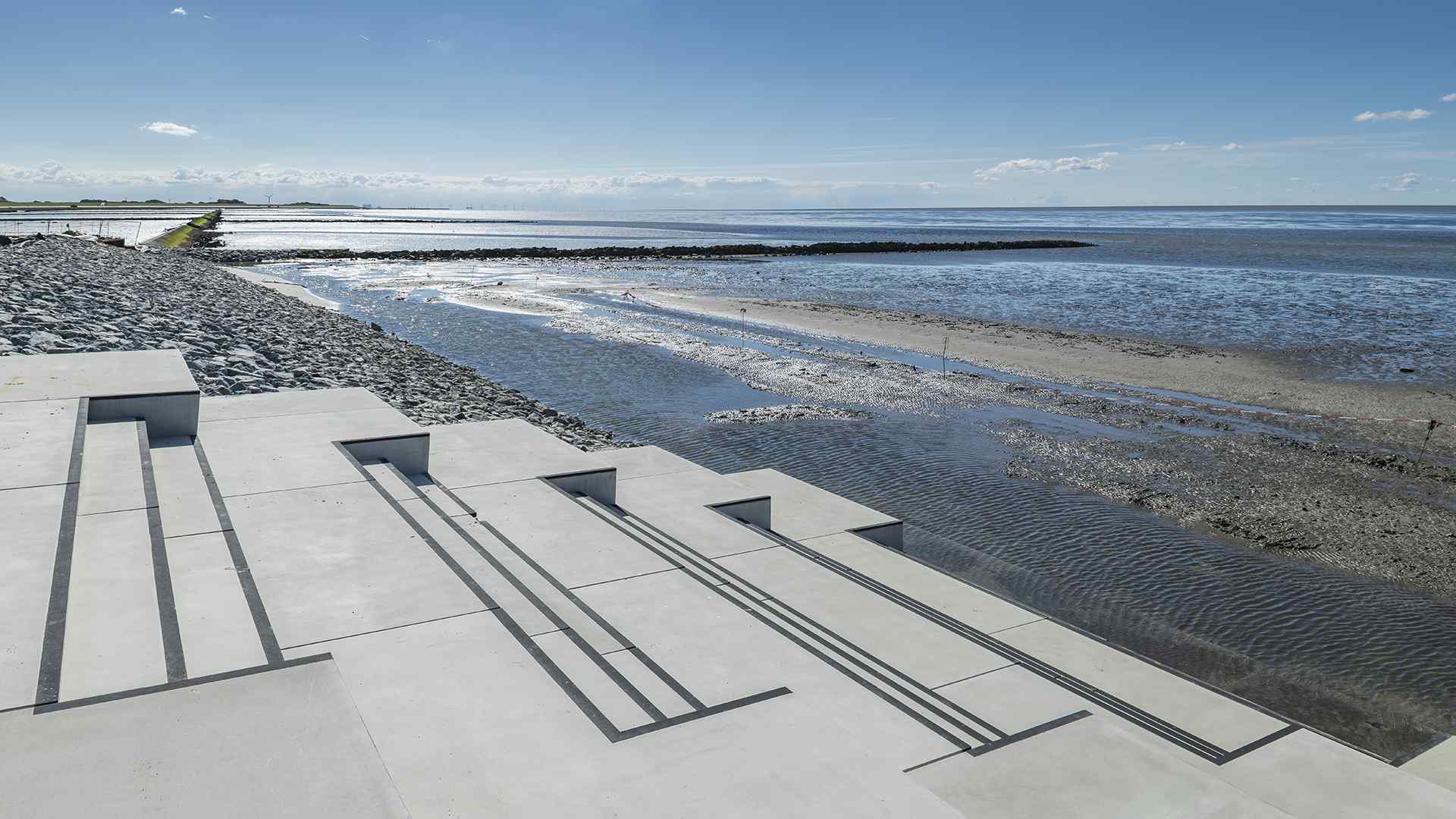 Dabei wurde das Deckwerk der Wasserkante als Steinschüttverklammerung mit Teil- und Vollverguss erneuert und mit einer Stahlspundwandkante am Fuße gesichert. Außerdem wurden zwei kleine und eine große Meeresterrasse als Treppenanlagen zum Watt und ein keisförmiger Ausguck mit einem Radius von 10 Metern aus Betonfertigteilen errichtet. Die rundumlaufende Promenade wurde aus sandfarbenem Asphalt samt Unterbau hergestellt, wobei taktile Leitsysteme verwendet wurden und alles barrierefrei erreichbar ist. Zusätzlich wurde eine barrierefreie Rampe mit einer Neigung von 2,8 Prozent als Zugang zum Wattenmeer gebaut.