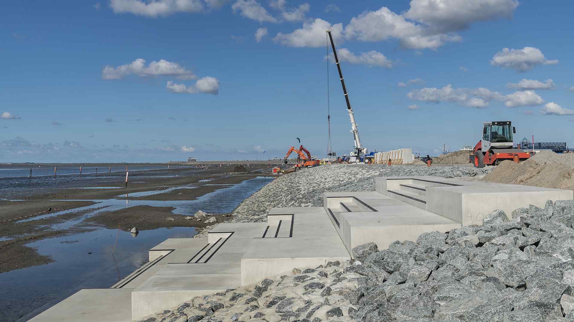 Im Bereich der Dünen ist der vorhandene Sandstrand aufgefüllt und die Dünen sind neu modelliert worden. Ein Teil dieses Projekts wurde als BIM-Projekt geplant und ausgeführt.