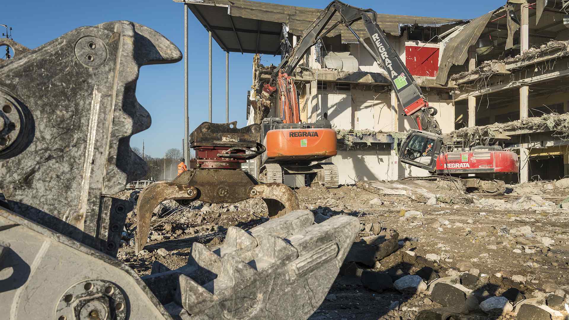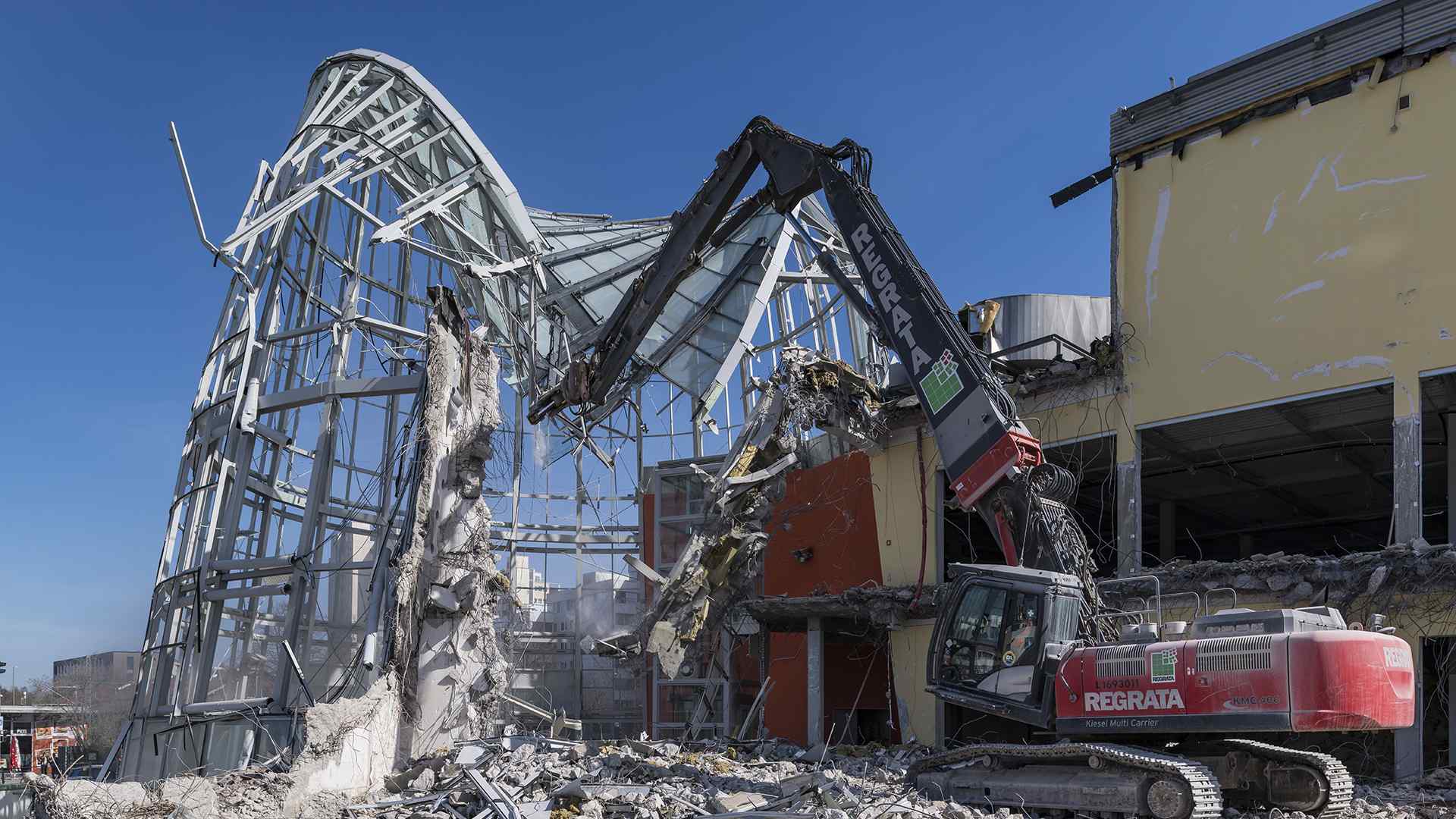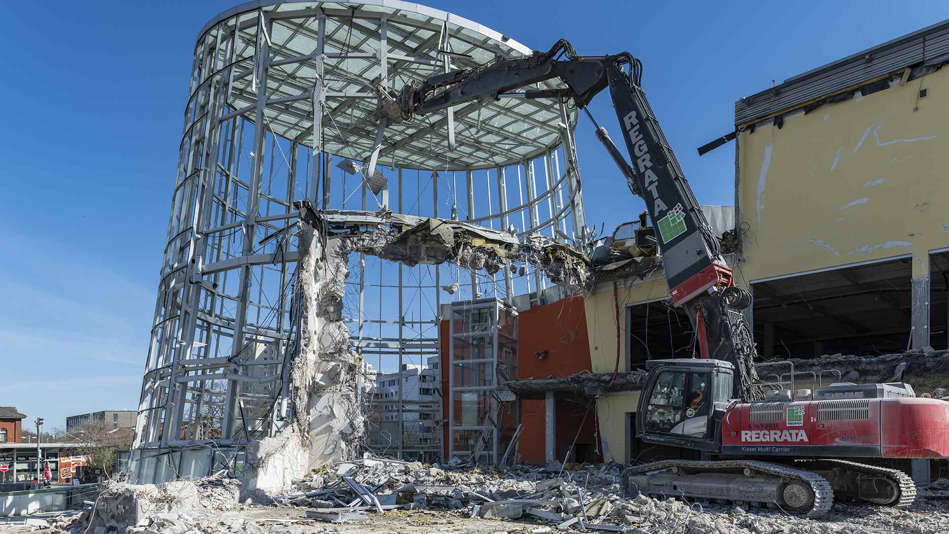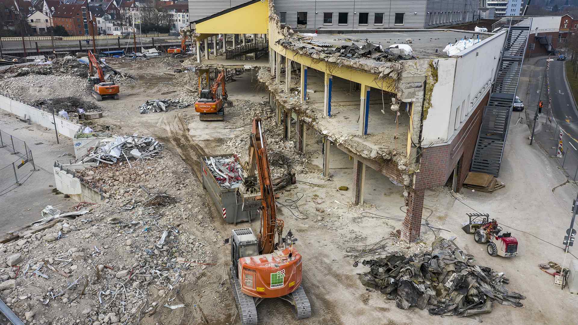Auf einer der größten Baustellen Bremens stellt der Abbruchspezialist Regrata eindrucksvoll seine Kompetenz unter Beweis. Das Unternehmen der Matthäi-Gruppe realisiert den Abbruch eines Shopping-Centers, um Platz für den Neubau eines Stadtquartiers zu schaffen. Das Großprojekt wird ausschließlich mit eigenen Fachkräften und dem eigenen Fuhr- und Maschinenpark umgesetzt. Große Teile des Abbruchmaterials wird direkt auf der Baustelle getrennt und anschließend dem Recycling und der Entsorgung zugeführt.