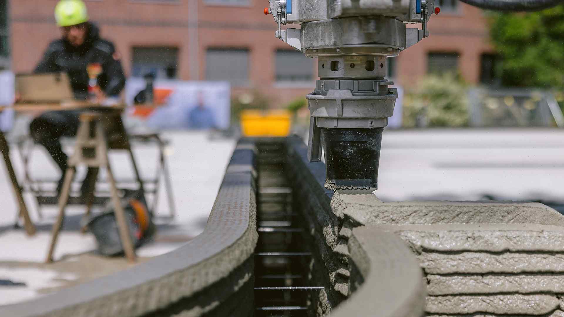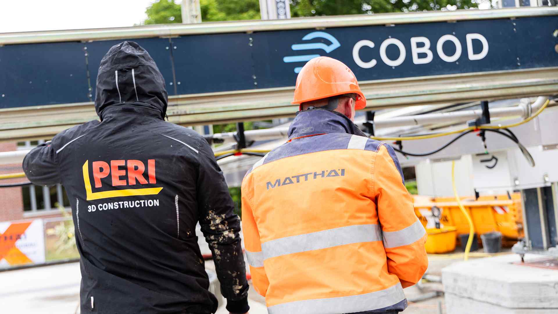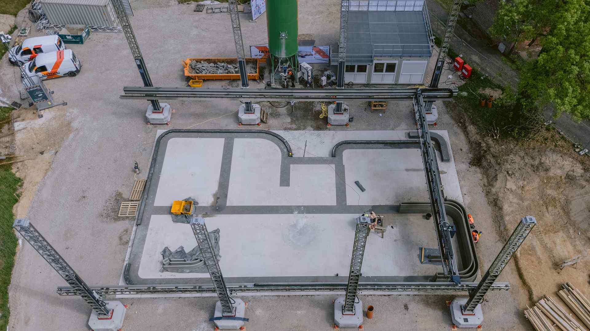 Der Druckstart erfolgte am 21. Mai 2025. Innerhalb von insgesamt 105 Stunden Druckzeit – 50 Stunden für das Erdgeschoss, 55 für das Obergeschoss – wird der COBOD BOD2 Drucker die Wandkonstruktion schichtweise aufbauen. Das 3D-Drucksystem wurde vor Ort mit einer Spannweite von 24 Metern Länge, 15 Metern Breite und 9 Metern Höhe installiert. Die Steuerung übernimmt ein geschultes Team von Matthäi Schlüsselfertigbau, unterstützt durch einen Supervisor von PERI.